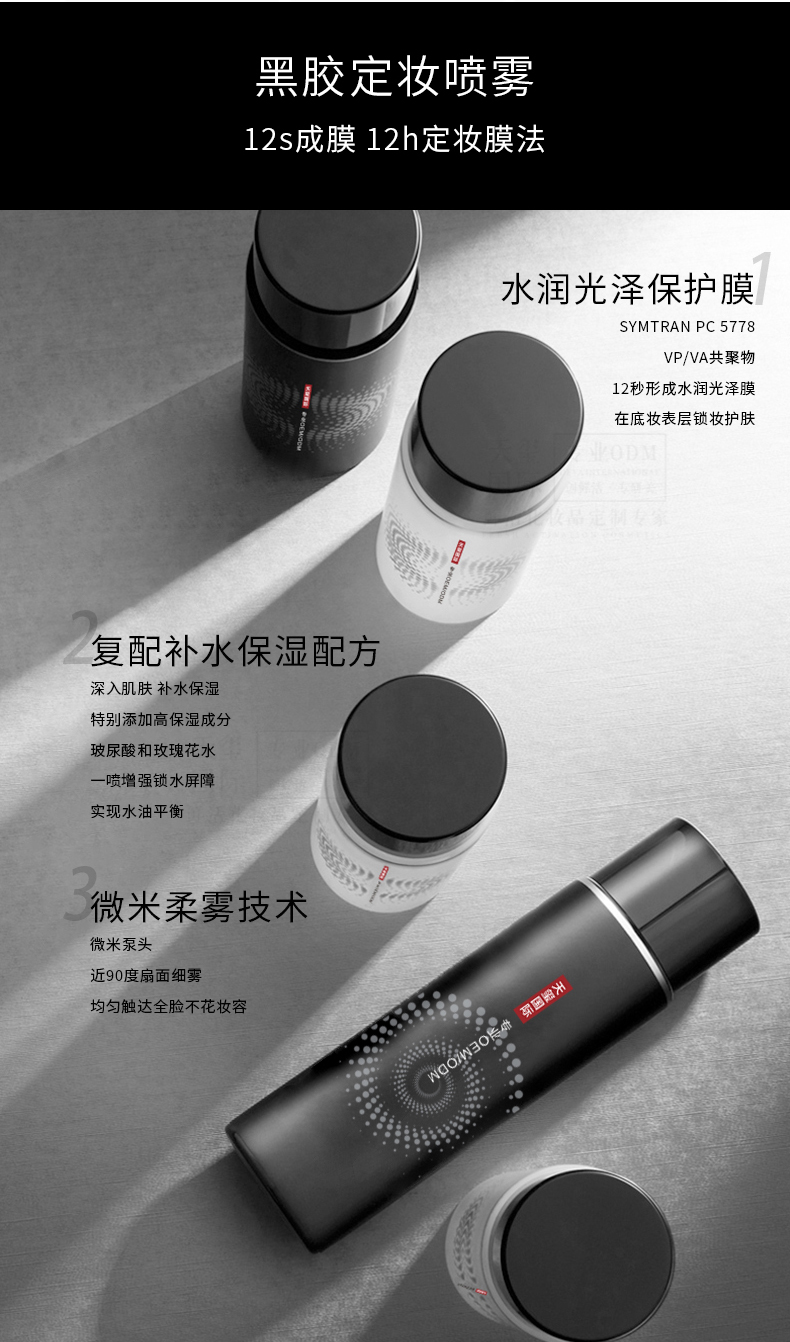 12s成膜,12h定妆膜法;水润光泽保护膜,在底妆表层锁妆护肤;复配补水保湿配方,高保湿成分;微米柔雾技术,近90度扇形细雾