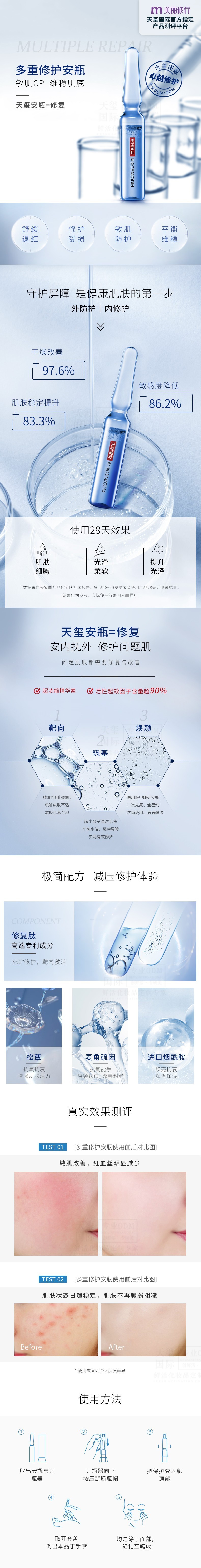 舒缓修护受损肌肤,敏肌防护,平衡维稳;精准作用问题肌,缓解皮肤不适,减轻色素沉积;超小分子直达肌底,平衡水油,强韧屏障,实现有效修护;医用级中硼硅安瓶,二次充氮,全密封次抛使用,滴滴鲜浓