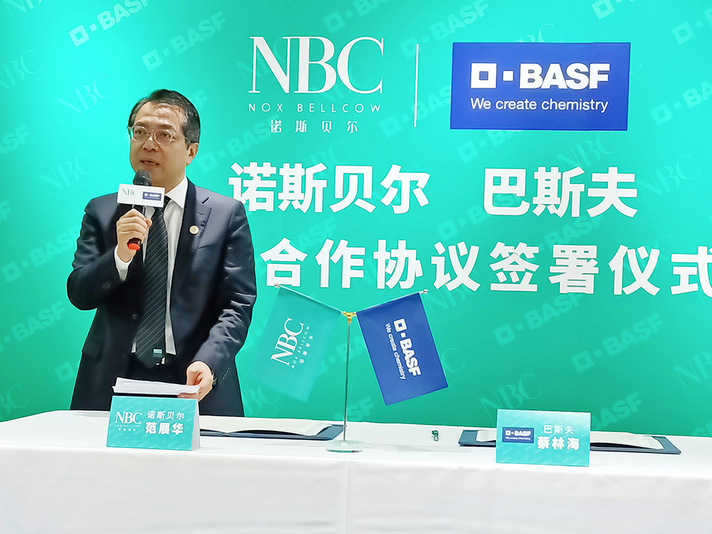 诺斯贝尔行政总裁范展华、副总裁(研发)邱晓锋以及副总裁(市场策划)麦耀雅代表诺斯贝尔出席。巴斯夫护理化学品部大中华区业务管理资深总监蔡林海、个人护理大中华区业务总监徐雅夫博士代表巴斯夫出席本次签约仪式。