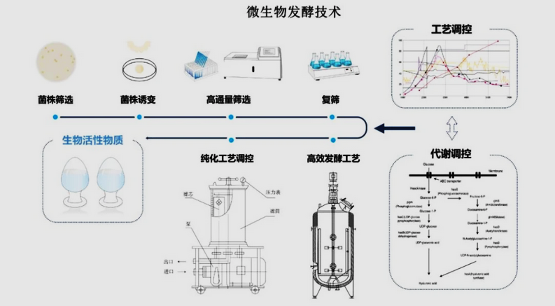 微生物发酵既能合成氨基酸、有机酸、黄酮、多酚等易吸收的小分子,也能制造多糖、多肽或蛋白等具有重要功效的大分子,既能够生产具有功效作用的活性成分,也能生产表面活性剂等辅助材料。