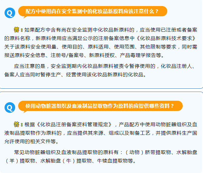 答:根据《化妆品注册备案资料管理规定》,产品配方中使用动物脏器组织及血液制品提取物作为原料的,应当提供其来源、组成以及制备工艺,并提供原料生产国允许使用的相关文件等。