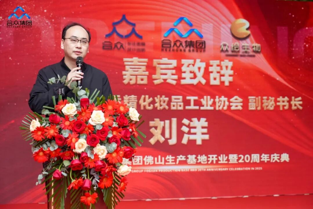 未能到场的中国香料香精化妆品工业协会理事长颜江瑛,以及上海CBE、中国美容博览会创始人、中国美容美发协会副会长桑敬民,也通过视频形式,向合众集团生产基地开业暨二十周年庆典表示由衷的祝贺。